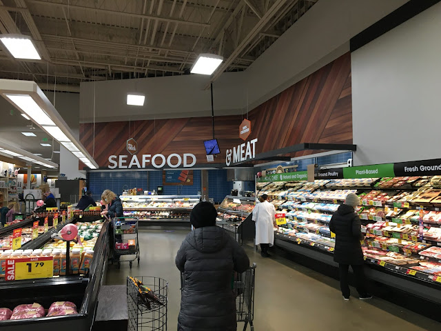 For one last look at the interesting part of the store, here's a look back at the meat department counter. Would it have killed them to at least extend the service department decor through the rest of the meat alcove? It looks so awkward having it cut off like that...