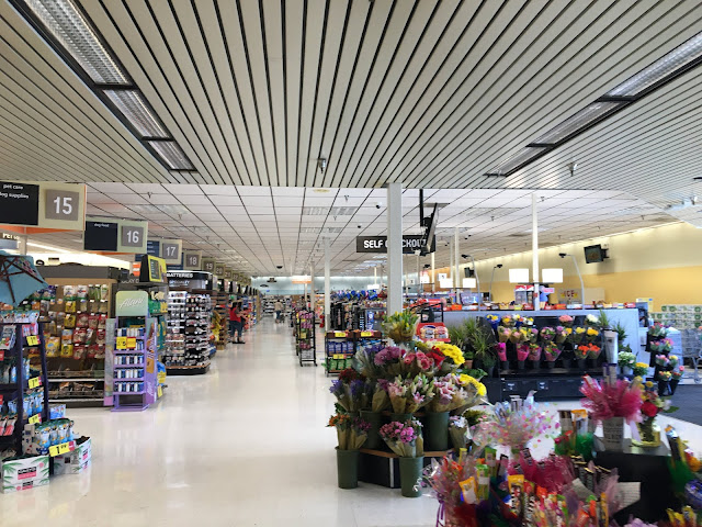 In addition to the physical separation, the low ceiling in the corridor between the two salesfloors adds a level of visual separation and furthers my feelings that this was an intentional design choice, for whatever reason. In addition to its space by the garden center, the floral department also occupies the space right inside the entrance to the store, beyond which the remaining front checkouts unfold. I really wish I had been able to find a pre-remodel picture of this portion of the store, so I could confirm whether there were always checkouts here or if these were added as a replacement for the set in the grocery side; either way, it's just bizarre that Kroger decided to get rid of the grocery ones.